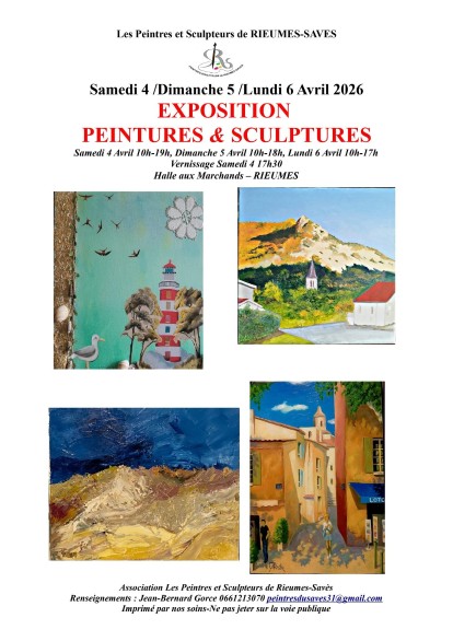 Date de début3 avr. 2026Date de fin6 avr. 2026Masquer les dates de publicationtrueDescriptionL'association des Peintres et Sculpteurs de Rieumes-Savès vous invite à leur exposition qui se tiendra les 4, 5 et 6 avril à la Halle aux Marchands de Rieumes de 10h à 18h.