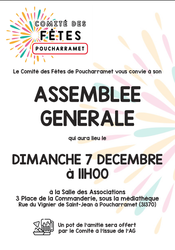 L'Assemblée Générale du comité des fêtes de Poucharramet se déroulera ce dimanche à 11 h 00 à la salle des associations.